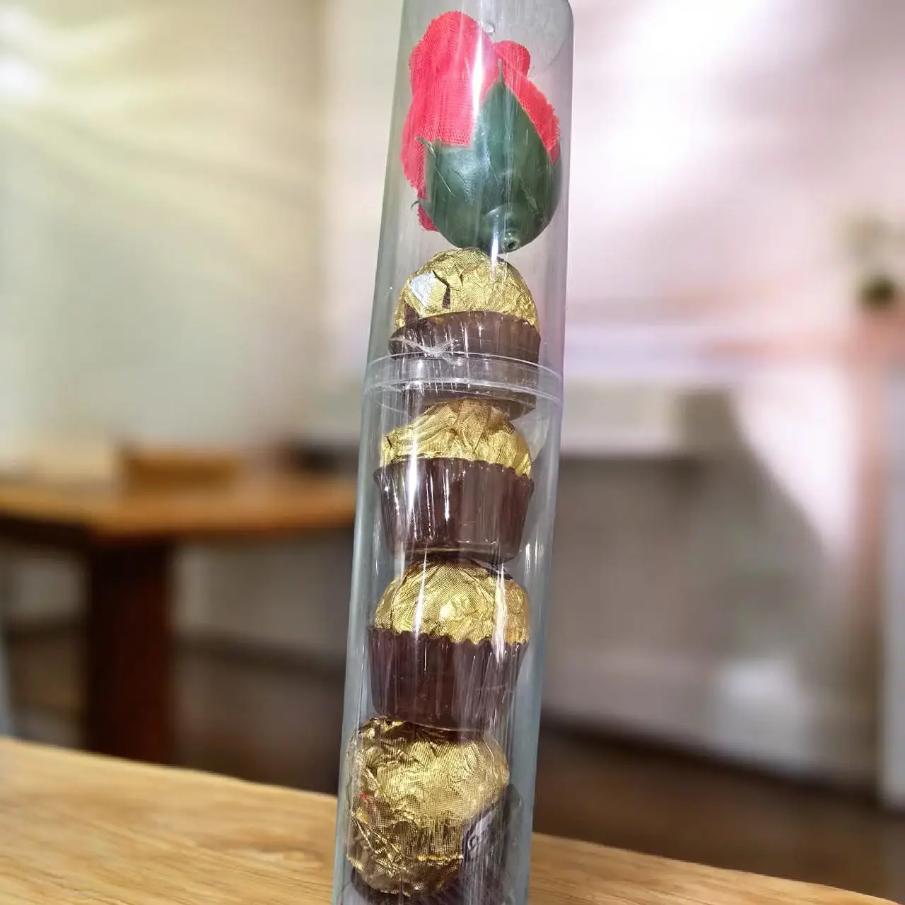 Elegant Presentation: A transparent minimalist cylinder containing premium gold-foil wrapped chocolates, topped with a beautiful red rose.